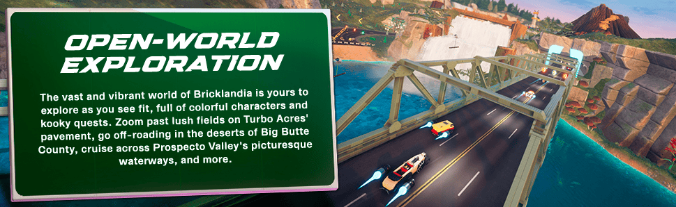 Welcome to Bricklandia, home of a massive open-world LEGO® driving adventure. Race anywhere, play with anyone, build your dream rides, and defeat a cast of wild racing rivals for the coveted Sky Trophy! In LEGO 2K Drive, your awesome transforming vehicle gives you the freedom to speed seamlessly across riveting racetracks, off-road terrain, and open waters. Explore the vast world of Bricklandia, show off your driving skills, and build vehicles brick-by-brick!